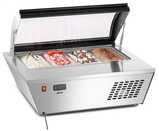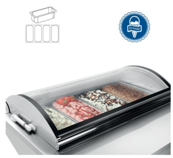 Για τις μεμονωμένες σας σπεσιαλιτέ παγωτού – Με τα 4 αφαιρούμενα δοχεία από 6,5 λίτρα, αυτή η βιτρίνα παγωτού αποτελεί τη μικρή λύση εξοικονόμησης χώρου για την προετοιμασία επιδόρπιου σε όλες τις επαγγελματικές κουζίνες γαστρονομίας.