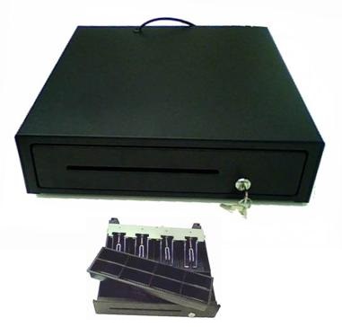 Μεταλλικό συρτάρι - Εσωτερικό συρόμενο πλαστικό - 4 θέσεις για χαρτονομίσματα (με μεταλλικά ελάσματα) - 8 θέσεις για κέρματα (με αποσπώμενο κερματοδέκτη) - Χρώματος Μαύρο & Άσπρο. - Διαστάσεις : 350mm (Π) x 380mm(Μ) x 90mm(Y) - Κλειδαριά 3 θέσεων - Διατίθεται πηνίο 6V ή 12V ή 24V - Δυνατότητα connector επιλογής χρήστη (τύπος Καρφί, RJ11, RJ14 κ.τ.λ.)
